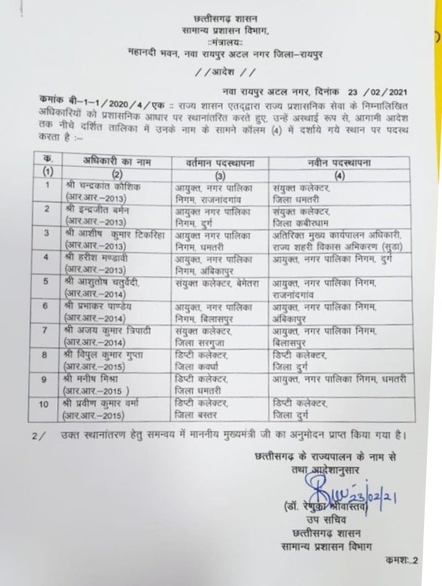 बिलासपुर 24 फरवरी 2021। राज्य सरकार की सामान्य प्रशासन विभाग द्वारा आज प्रदेश के 10 नगर निगम अधिकारियों का ट्रांसफर लिस्ट जारी किया गया है।