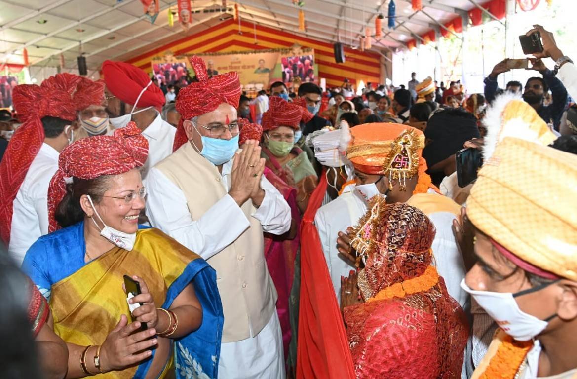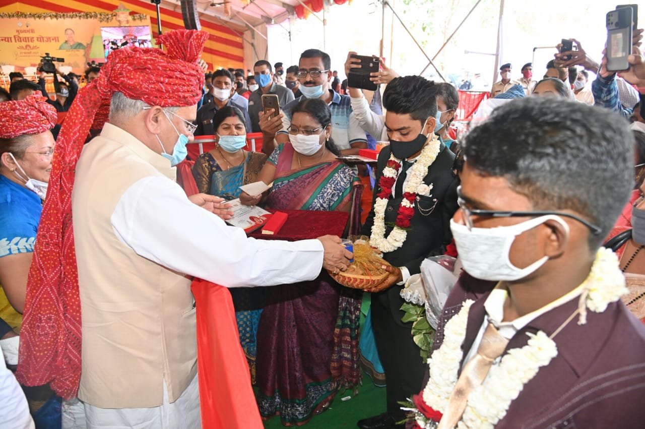 मुख्यमंत्री श्री भूपेश बघेल आज राजधानी रायपुर के बलबीर सिंह जुनेजा इंडोर स्टेडियम परिसर में आयोजित मुख्यमंत्री कन्या विवाह समारोह में शामिल हुए