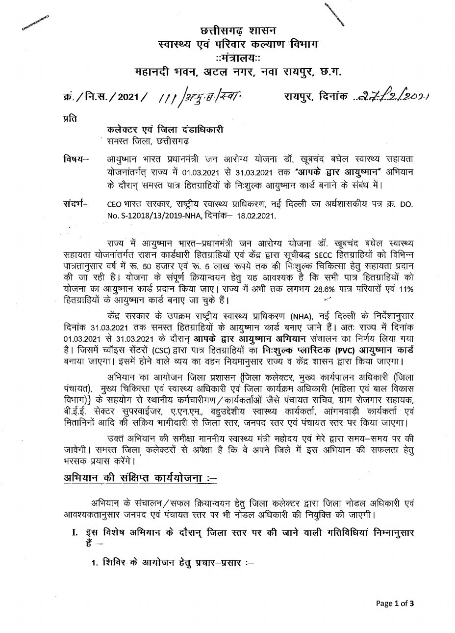 रायपुर 28फरवरी 2021 – प्रदेश में अब 01 मार्च से आयुष्मान कार्ड (प्रधानमंत्री जन आरोग्य योजना) बनने जा रहे है। इस कार्ड को दिखाते ही राज्य के अनुबंधित सरकारी एवं प्राइवेट हॉस्पिटल में शतप्रतिशत निःशुल्क इलाज मिलेगा। 01 मार्च से 31 मार्च 2021 तक प्रदेश के चॉइस सेंटर में निःशुल्क कार्ड बनाये जायेंगे। 25 फरवरी 2021 को आयुष्मान भारत प्रधानमंत्री जन आरोग्य डॉ. खूबचंद बघेल स्वास्थ्य सहायता योजना की राज्य नोडल एजेंसी ने इससे सम्बंधित गाइडलाइन सभी सीएमएचओ को जारी कर दिए है।
