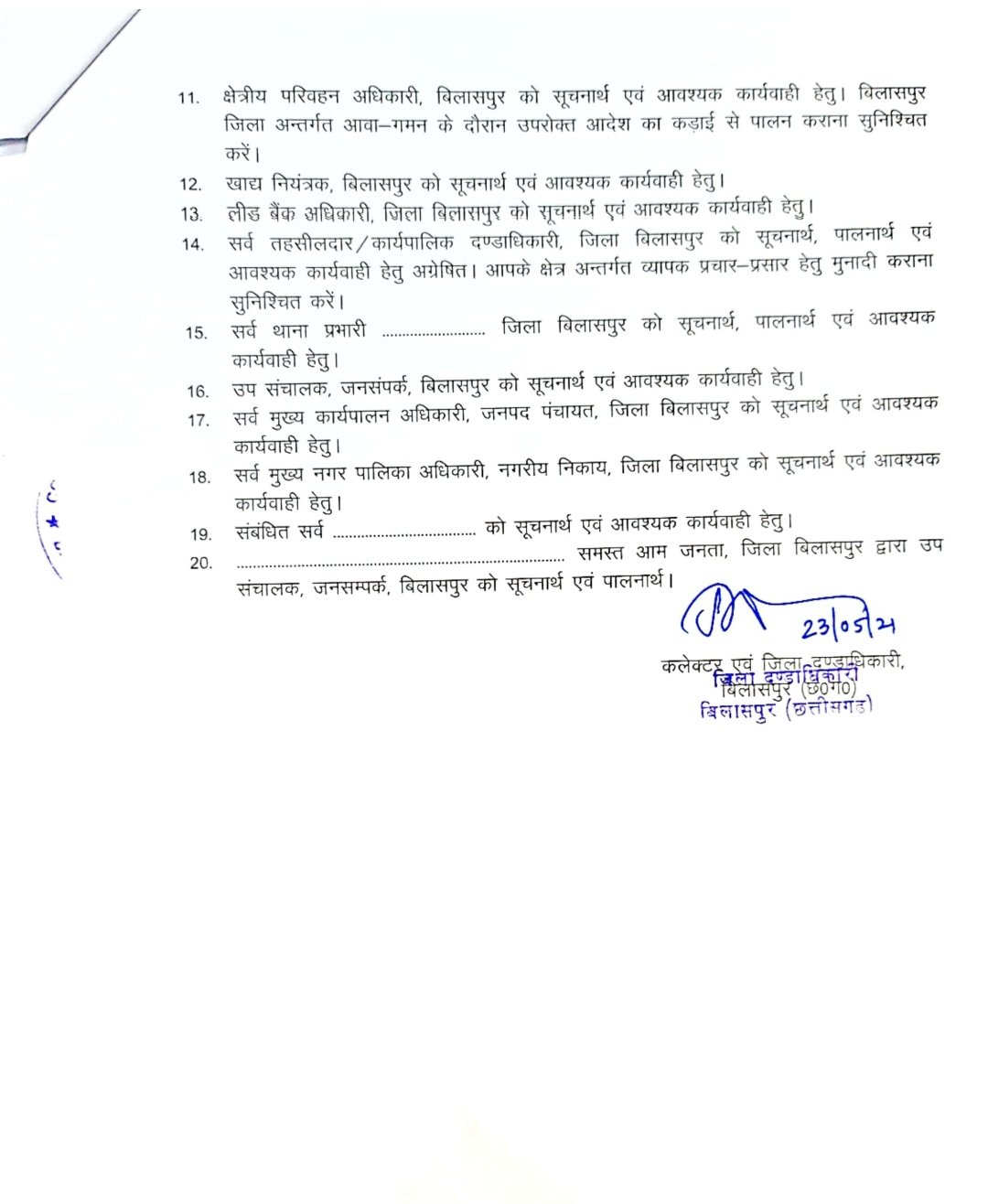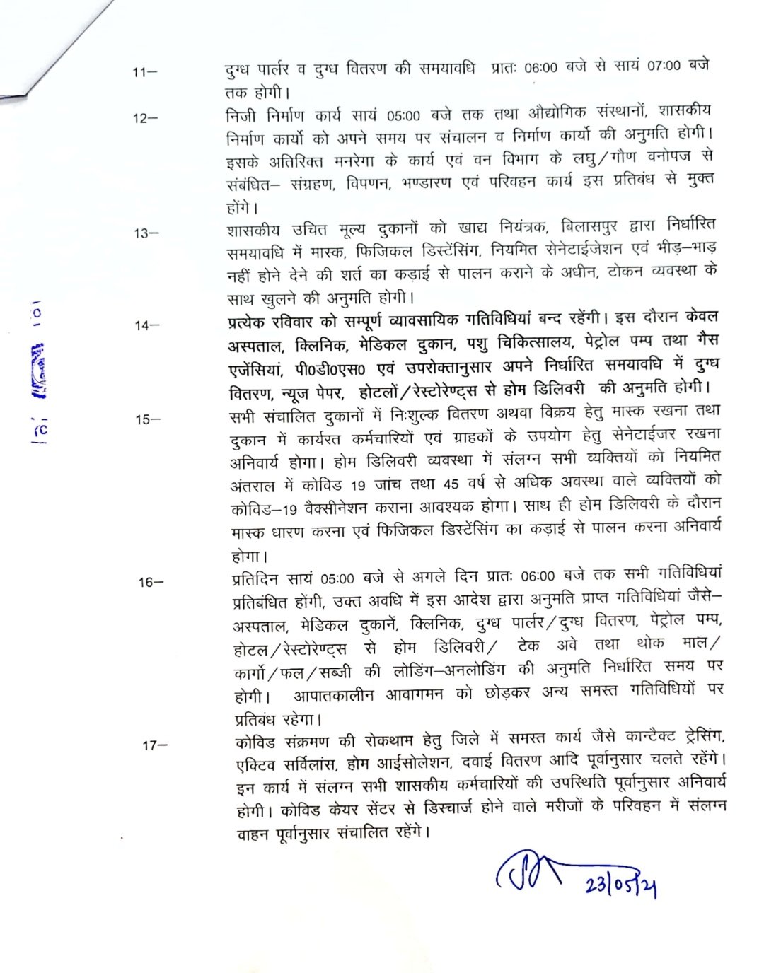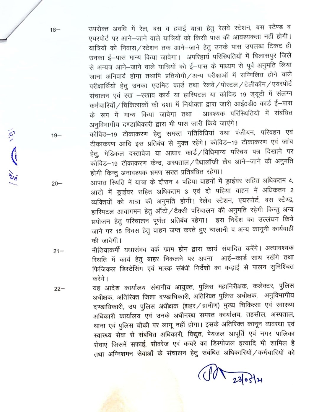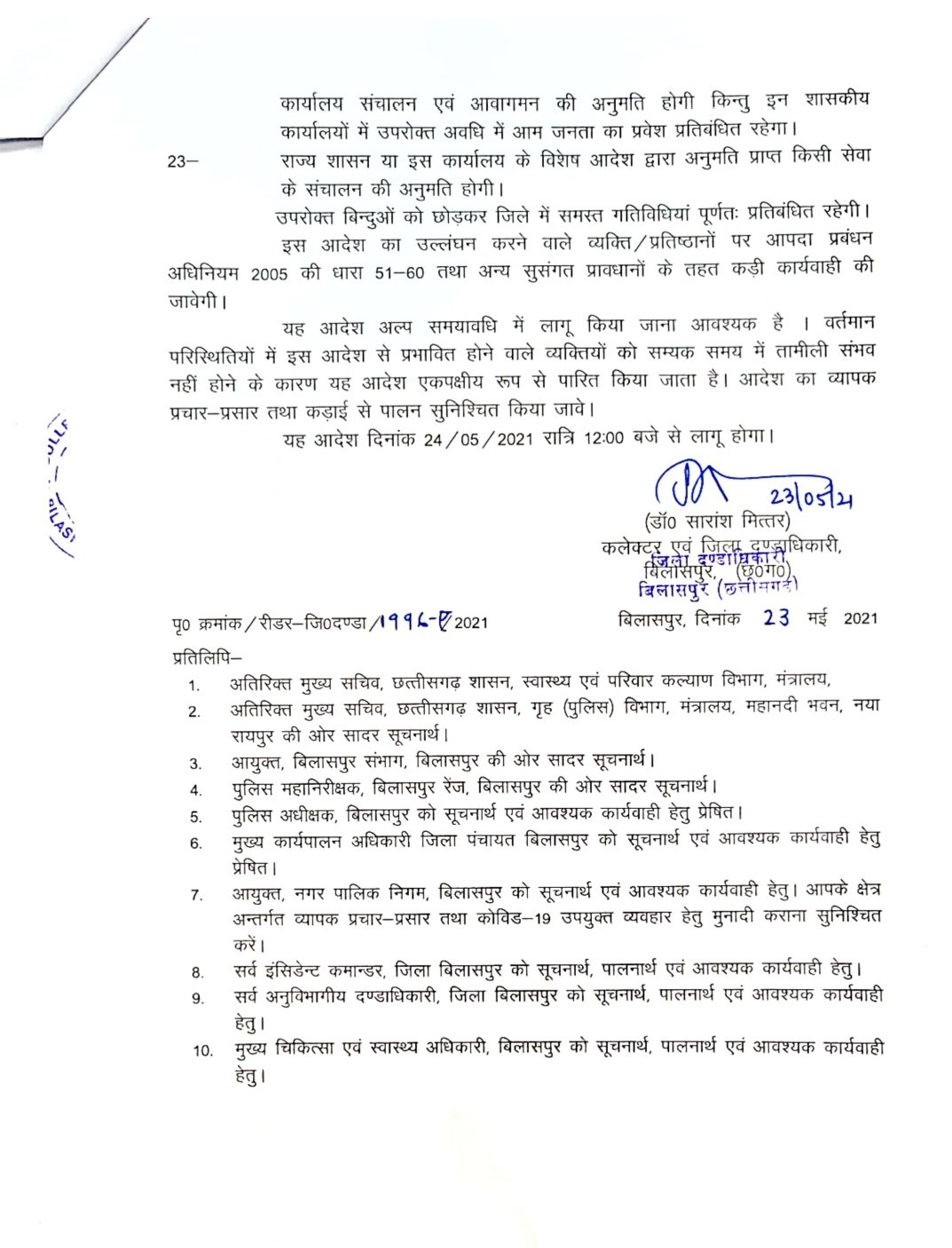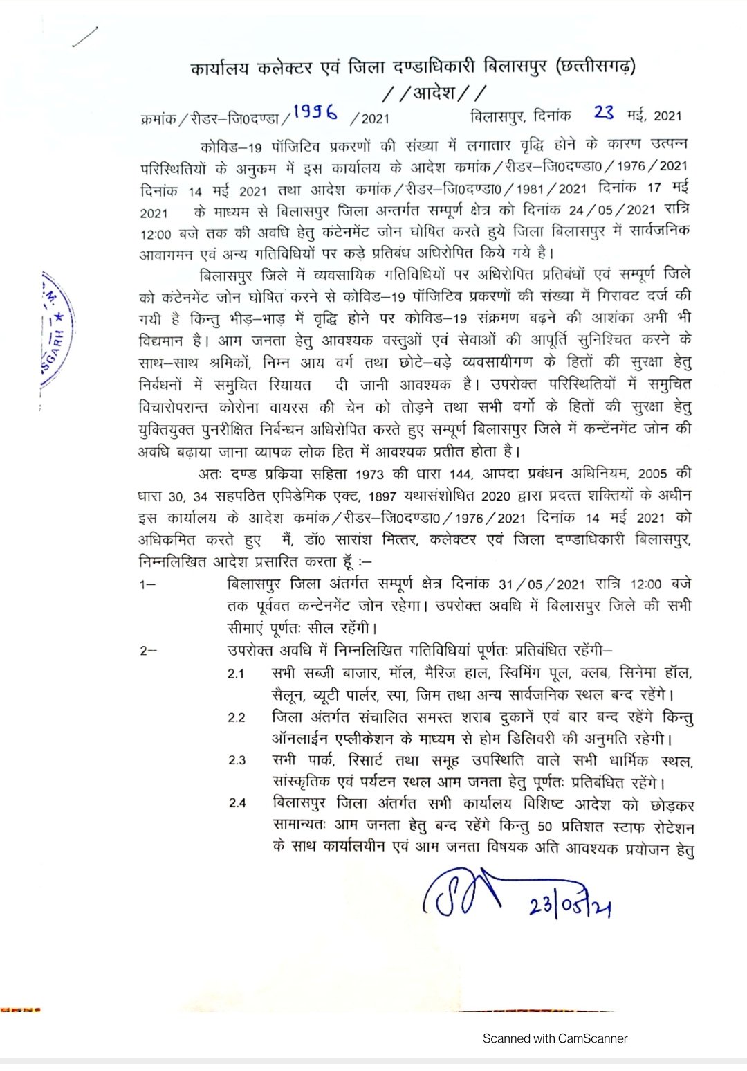 ब्रेकिंग-बिलासपुर 23 मई 2021।जिले में बढ़ते कोरोना संक्रमण के रोकथाम के लिए एक बार पुनः लॉक डाउन को बढ़ा दिया गया है।