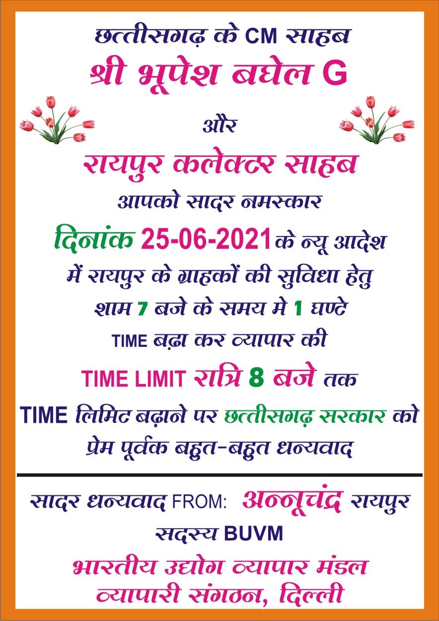अन्नूचन्द्र (सदस्य BUVM , भारतीय उद्योग व्यापार मंडल के सदस्य ,व्यापारिक संगठन दिल्ली ) ने इसके लिए प्रदेश के मुख्यमंत्री भूपेश बघेल व राजधानी के कलेक्टर का आभार मानते हुए धन्यवाद ज्ञापित किया है और कहा कि प्रदेश सरकार ने व्यापारी वर्गों के हितों का ध्यान रखते हुए जो दुकान खोले रखने के समय में 1 घंटे का इजाफा किया है उससे लिए सभी व्यापारी बंधु बेहत खुश है और सभी ने इसके लिए मुख्यमंत्री व कलेक्टर का आभार माना है।