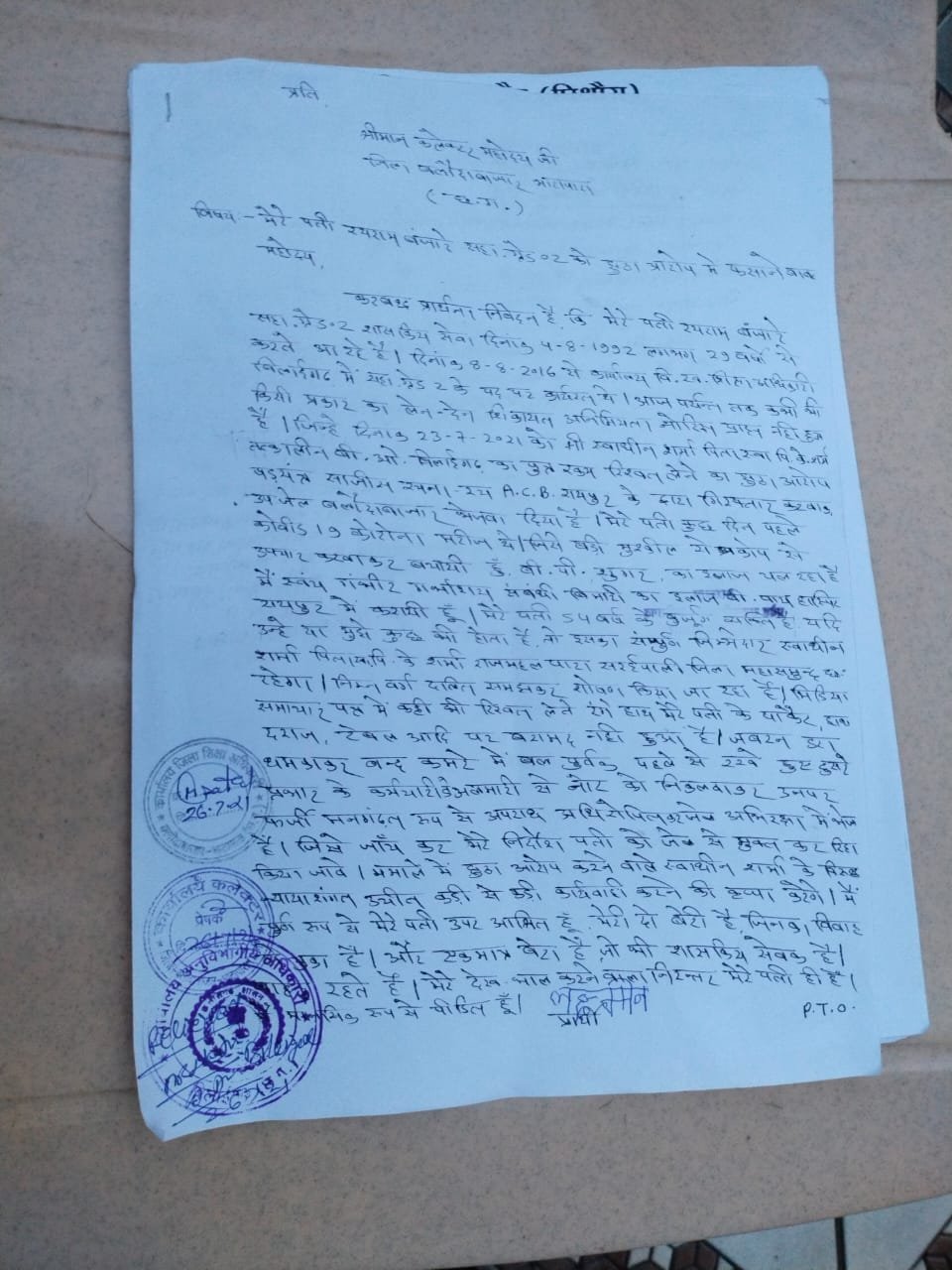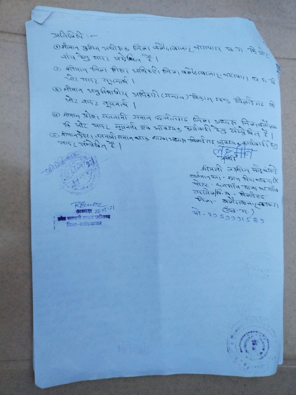 शिक्षा अधिकारी बिलाईगढ में सह.ग्रेड 2 के पद पर पदस्थ थे।उनके कार्यकाल में आज पर्यन्त तक कभी भी किसी प्रकार का लेन-देन, अनिमियता, नोटिस की शिकायत प्राप्त नहीं हुआ है। जिन्हें दिनांक 23-7-2021को श्री स्वाधीन शर्मा पिता स्व.पि.के.शर्मा षडयंत्र रचना रच कर A.C.B.रायपुर के व्दारा गिरफ्तार करवाकर उपजेल बलौदाबाजार भेजवा दिया है। मेरे पति कुछ दिन पहले कोवीड19 कोरोना के मरीज थे। जिसे बड़ी मुश्किल से प्रकोप से उपचार करवाकर बचाई हूं उनका बी.पी./शुगर का इलाज चल रहा है। मैं स्वयं गंभीर गर्भाशय संबंधी बिमारी से जूझ रही हूं मेरा इलाज वी.वाय हास्पिटल रायपुर में चल रहा है। मेरे पति 54 वर्ष के बुजुर्ग व्यक्ति हैं यदि उन्हें या मुझे कुछ भी होता है तो इसका संम्पुर्ण जिम्मेदार स्वाधीन शर्मा पिता स्व.पि.के.शर्मा राजमहल पारा सरईपाली जिला महासमुन्द (छ.ग.) रहेंगे। हम अनुसूचित जाति होने के नाते हमारे साथ अन्याय,अत्याचार कर शोषण किया जा रहा है। मिडिया समाचार पत्र में कहीं भी रिश्वत लेते रंगे हाथ से रकम मेरे पति के पाकैट ,हाथ,दराज, टेबल आदि पर बरामद नहीं हुआ है।जबरन डरा-धमकाकर बन्द कमरे में बल पूर्वक पहले से रखें हुए दुसरे प्रभार के कर्मचारी के अलमारी से नोट को निकलवाकर उनपर फर्जी मनगढ़ंत रूप से अपराध अधिरोपित कर जेल अभिरक्षा में भेजा है। जिसे जांच कर मेरे निर्दोष पति को जेल से मुक्त कर रिहा किया जावे।ममाले में झूठा आरोप करने वाले स्वाधीन शर्मा के विरुद्ध न्यायासंगत उचीत कड़ी से कड़ी कार्यवाही करने की कृप्पा करेंगे।