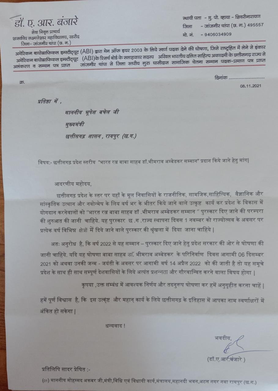 जांजगीर चांपा/शिवरीनारायण 10 नवंबर 2021 l स्थानीय प्रबुद्ध और सेवानिवृत्त प्राचार्य डॉ. ए. आर. बंजारे ने छत्तीसगढ़ के विधानसभा अध्यक्ष, मुख्यमंत्री, स्वास्थ्य मंत्री, विधि मंत्री तथा अन्य सभी मंत्रियों, संसदीय सचिवों और विधायकों को दिनांक 8. 11. 21 को पत्र भेजकर यह मांग की है, कि छत्तीसगढ़ राज्य उत्सव के अवसर पर प्रत्येक वर्ष 1 नवंबर को विभिन्न क्षेत्रों में वर्ष भर के भीतर उत्कृष्ट कार्य करने वालों को दिए जाने वाले सम्मान- पुरस्कार की श्रृंखला में राजनीति,समाज विज्ञान, साहित्य, संस्कृति और वैज्ञानिक उत्थान और नवोन्मेष तथा दलित उत्थान के लिए उत्कृष्ट कार्य करने वालों को ” भारत रत्न बाबा साहब डॉक्टर भीमराव अंबेडकर सम्मान ” पुरस्कार की परंपरा की शुरुआत छत्तीसगढ़ प्रदेश से की जानी चाहिए। डॉ बंजारे ने कहा की इस पुरस्कार के संबंध में उन्होंने अपना अभिमत भी स्पष्ट किया है. निश्चित रूप से यह मांग अत्यंत सराहनीय है।यह स्वीकृति दिए जाने पर सरकार का इसे बहुत अच्छा कदम माना जाएगा. बाबा साहब डॉक्टर भीमराव अंबेडकर भारत के संविधान निर्माता होने के साथ ही साथ विश्व के महान विद्वानों की पंक्ति में प्रथम कड़ी के रूप में मान्यता प्राप्त महानतम विद्वान है। निश्चित रूप से प्रदेश में ऐसे उत्कृष्ट कार्य कर पुरस्कार प्राप्त करने वालों की गरिमा तो बढ़ेगी ही, इससे प्रदेश सरकार की गरिमा भी बढ़ेगी।यह पुरस्कार आगामी बाबा साहब के परिनिर्वाण दिवस 6 दिसंबर 2021 या जन्म जयंती 14 अप्रैल 2022 के अवसर पर प्रदेश के मुख्यमंत्री को यह- सम्मान -पुरस्कार प्रदान करने की घोषणा करनी चाहिए।