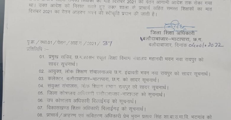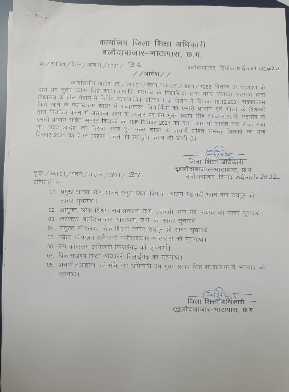 भटगांव/बिलाईगढ 06जनवरी2022 । प्रेम भुवन प्रताप सिंह शासकीय हायर सेकेण्डरी स्कूल भटगांव के छात्रों ने गत दिवस स्कूल परिसर के निजी भूमि खेल मैदान में अवैध रूप से निर्मित व्यवसायिक काम्प्लेक्स को हटाने गिधौरी सारंगढ़ मुख्य मार्ग भटगांव में दिनांक 16 दिसम्बर को चक्का जाम किया था l अध्ययनरत छात्रों के आंदोलन चक्का जाम को प्राचार्य एवं शाला के शिक्षकों द्वारा नियंत्रित करने में असफलता के आधार पर शासकीय बालक उच्चतर माध्यमिक प्रेम भुवन प्रताप सिंह विद्यालय के प्राचार्य सहित सभी शिक्षकों का दिसंबर माह के वेतन सहित आगामी आदेशअनिश्चितकालीन वेतन रोकने जिला शिक्षा अधिकारी बलौदा बाजार भाटापारा द्वारा आदेश जारी किया गया था।