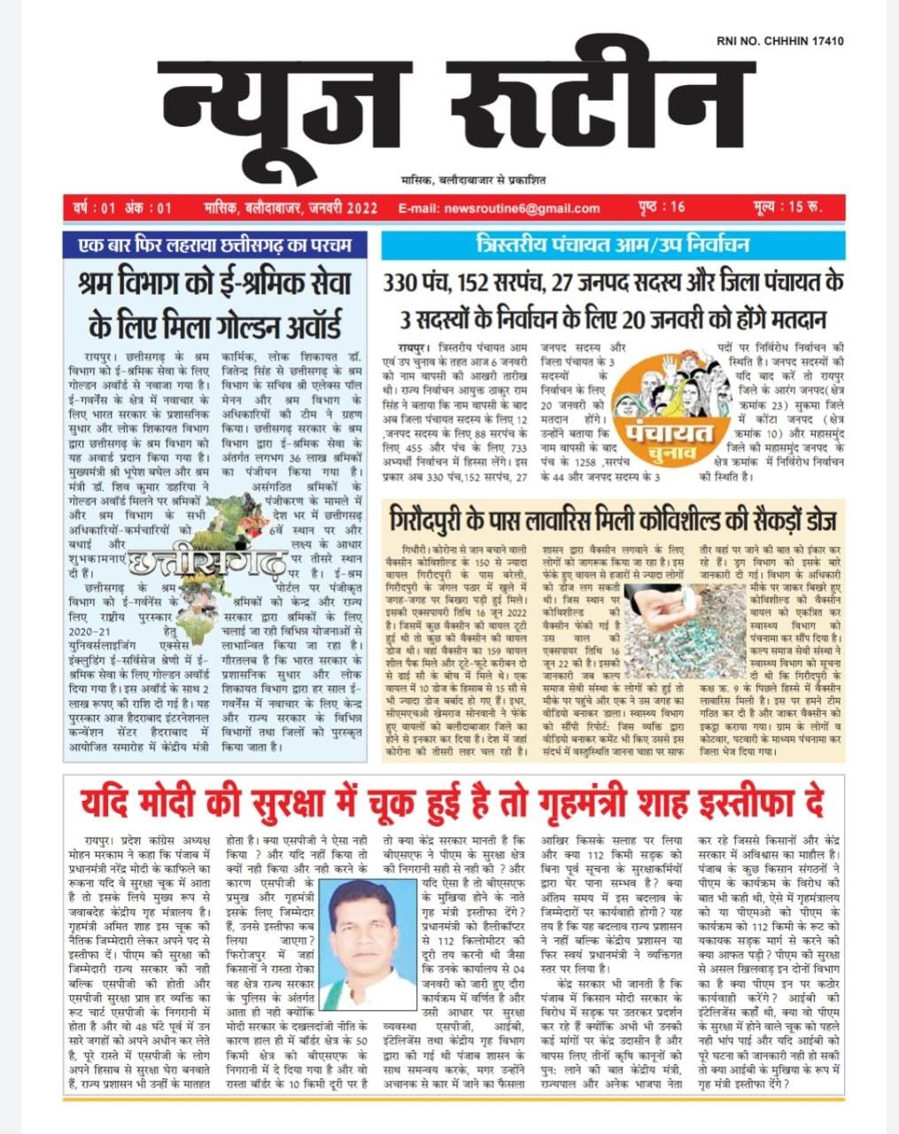 बलौदाबाजार/बिलाईगढ़ 19 जनवरी 2022 ।बलौदाबाजार भाटापारा जिले से 13 जनवरी को प्रकाशित मासिक अखबार न्युज रुटीन का विमोचन 17 जनवरी को छत्तीसगढ़ शासन की महिला बाल विकास ‌कैबिनेट मंत्री अनिला भेड़िया के कर कमलों से संपन्न हुआ ।न्युज रुटीन के संपादक गुलाब दीवान को प्रथम प्रकाशन व विमोचन की बधाई देते हुए जिला कांग्रेस कमेटी पूर्व उपाध्यक्ष तरुण खटकर ने कहा कि बिलाईगढ अंचल के कृषि परिवार से जुड़े एक किसान पुत्र युवा गुलाब दीवान की सोच खुद के अखबार का सपना आज हकीकत में पुरा हुआ उन्होंने गुलाब दीवान की सोच को युवाओं के लिए प्रेरणादायक बताते हुए कहा युवा मेहनत और लगन से लक्ष्य को हासिल कर सकते है।