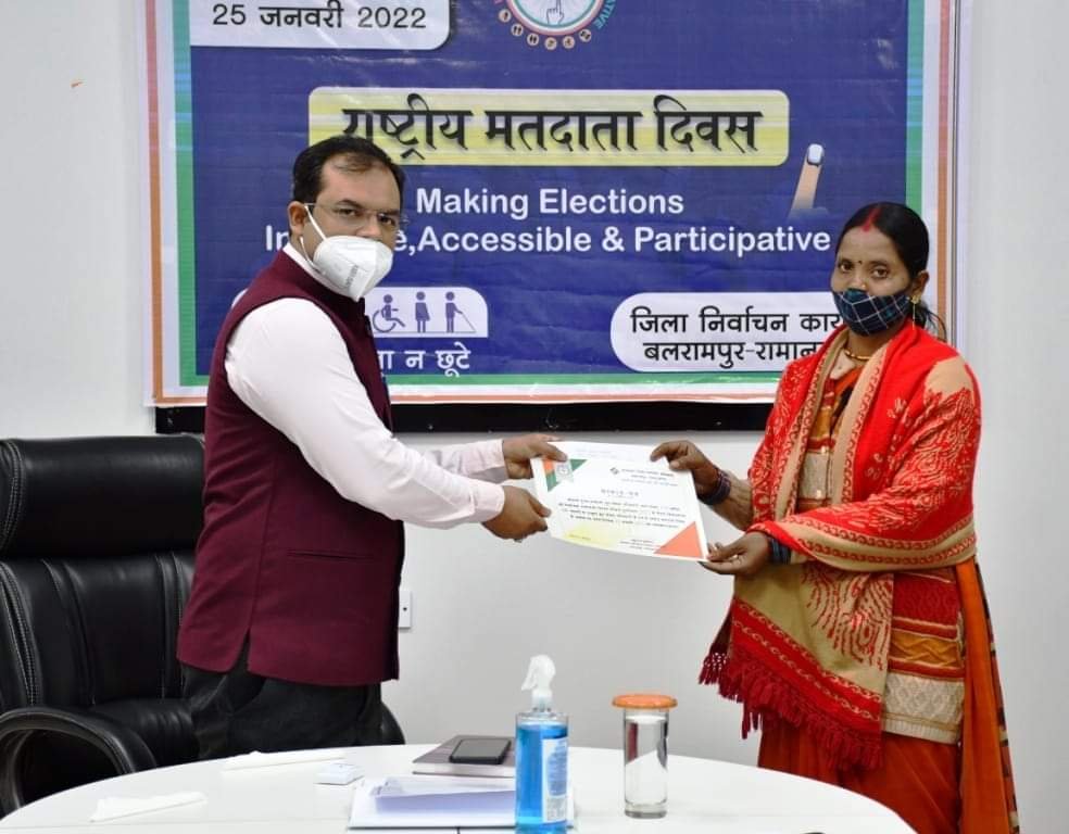 बलरामपुर 25 जनवरी 2022 l आज 12वें राष्ट्रीय मतदाता दिवस के अवसर पर मुख्य निर्वाचन पदाधिकारी छत्तीसगढ़ कार्यालय द्वारा गूगल मीट के माध्यम से कार्यक्रम आयोजित किया गया। राज्य स्तरीय कार्यक्रम में छत्तीसगढ़ राज्य सूचना आयोग के अध्यक्ष श्री एम.के. राउत एवं छत्तीसगढ़ राज्य निर्वाचन आयोग के निर्वाचन आयुक्त श्री ठाकुर रामसिंह उपस्थित थे। कार्यक्रम में मुख्य निर्वाचन पदाधिकारी, छत्तीसगढ़ श्रीमती रीना बाबा साहब कंगाले ने वर्ष 2021 में निर्वाचन एवं स्वीप की गतिविधियों से सभी को अवगत कराया।