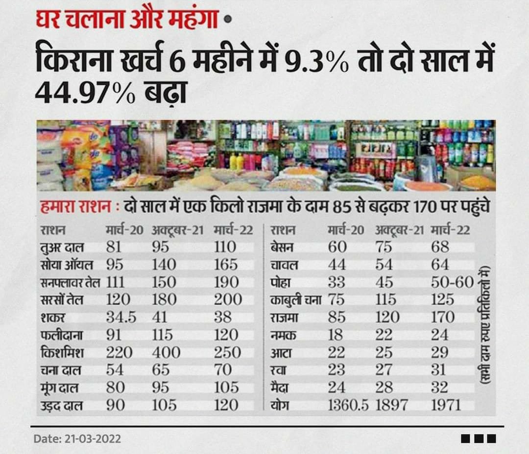 बलौदा बाजार 03 मई 2022। यह 2014 से 2022 तक लोगों द्वारा प्रतिदिन उपभोग की जाने वाली वस्तुओं की कीमतों में वृद्धि की औसत दर है।