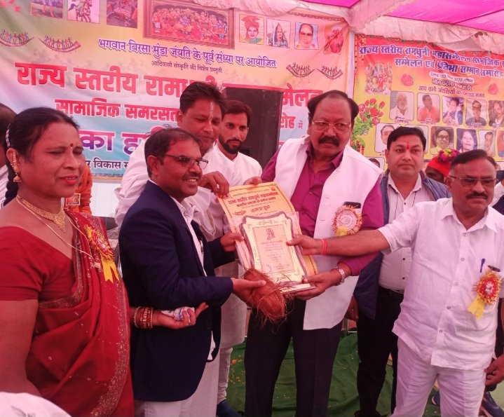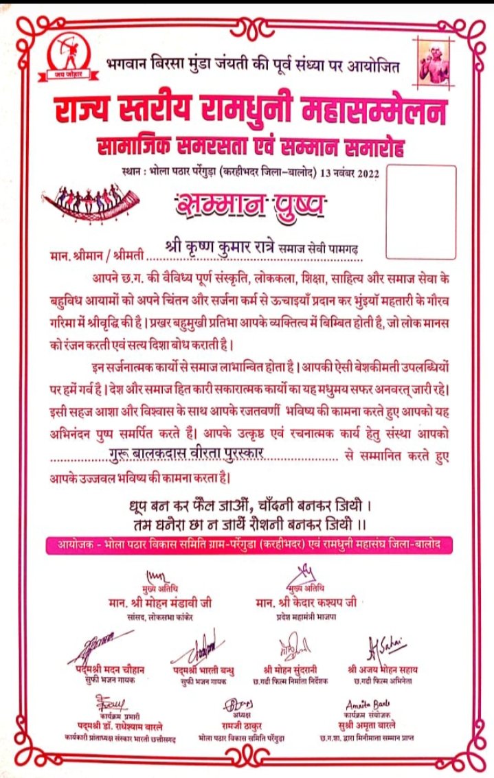 राज्य स्तरीय “रामधुनी महासम्मेलन”सामाजिक समरसता एवं सम्मान समारोह “भोला पठार-पर्रे गुड़ा करही भदर-जिला-बालोद छत्तीसगढ़ में जिला-जांजगीर चाम्पा जनपद पामगढ़ के वरिष्ठ कार्यकर्ता एवं °कृष्णा साउंड एवं टेंट हाउस” के संचालक कृष्णा रात्रे जी को “गुरु बालकदास वीरता पुरस्कार”समाज सेवा”के क्षेत्र में प्रदान किया गया है निःसंदेह दूरस्थ अंचल जनजातीय क्षेत्रों में इस तरह का सम्मान प्राप्त करना अपने आप मे एक बहुत बड़ी ऐतिहासिक उपलब्धियों को प्रदर्शित करती है इस यादगार उपलब्धियों की खबर सुनकर पामगढ़ क्षेत्र के वरिष्ठजन “रामखिलावन दिनकर,श्रीराम लहरे,रोहित रत्नाकर, दूजेराम ज्योति, रामगिलास खूंटे,नरेंद्र भास्कर,बसंत कुर्रे, उमेश प्रधान,अश्वनी टण्डन, एवं साथियों ने बहुत-बहुत बधाई एवं दीर्घायु की मंगलकामनाएं प्रेषित किये!