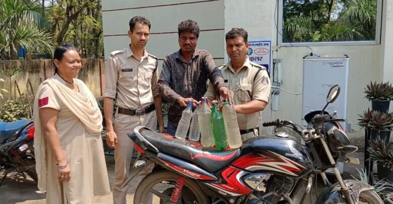 रायगढ़ । एसएसपी सदानंद कुमार के निर्देशन एवं एडिशनल एसपी संजय महादेवा व सीएसपी अभिनव उपाध्याय के मार्गदर्शन पर नव पदस्थ थाना प्रभारी चक्रधरनगर निरीक्षक प्रशांत राव अहेर द्वारा लगातार फरार वारंटियों एवं अवैध शराब पर कार्यवाही की जा रही है । इसी क्रम में आज सुबह थाना प्रभारी चक्रधरनगर के नेतृत्व में चक्रधरनगर स्टॉफ द्वारा रेगड़ा-बरलिया मार्ग पर नाकेबंदी कर मोटरसाइकिल होंडा ड्रीम युगा सीजी 13 एबी-6096 पर शराब तस्करी कर रहे आरोपी को पकड़ा गया । पकड़ा गया आरोपी अपना नाम दशरथ अगरिया पिता आशा अगरिया उम्र 35 साल निवासी बरलिया लोहारपारा थाना चक्रधरनगर का रहने वाला बताया जिसके 3 नग 2-2 लीटर क्षमता वाली प्लास्टिक बॉटल तथा 2 नग 1-1 लीटर क्षमता वाली प्लास्टिक बोतल में कुल 8 लीटर महुआ शराब कीमत ₹800 का बरामद हुआ, जिसकी विधिवत जप्ती की गई है । आरोपी ने पूछताछ में महुआ शराब बिक्री के लिये लेकर जाना बताया है । आरोपी के कृत्य पर थाना चक्रधरनगर में आरोपी दशरथ अगरिया पर धारा 34(2),59(क) आबकारी एक्ट के तहत कार्यवाही कर आरोपी को को मुख्य न्यायिक मजिस्ट्रेट महोदय के न्यायालय न्यायिक रिमांड पर भेजा गया है । शराब रेड कार्यवाही में थाना प्रभारी चक्रधरनगर निरीक्षक प्रशांत राव अहेर, महिला प्रधान आरक्षक अरुणा चौरसिया, आरक्षक अभय यादव, चंद्र कुमार बंजारे तथा कीर्ति सिंह राजपूत की प्रमुख भूमिका रही है ।