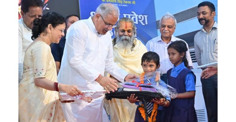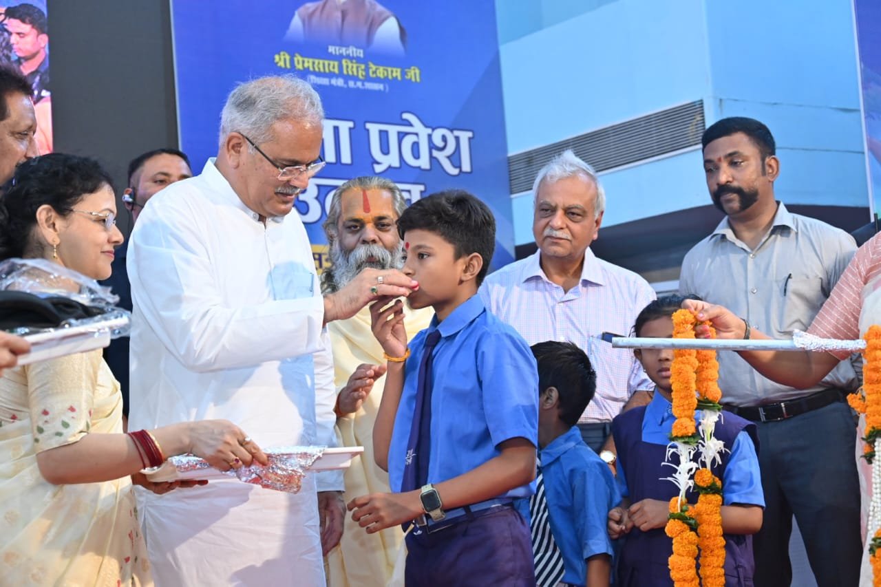 रायपुर, 26 जून 2023। मुख्यमंत्री भूपेश बघेल ने आज नए शिक्षा और शाला प्रवेशोत्सव के अवसर पर नव प्रवेशी बच्चों का तिलक लगाकर, मुंह मीठा कराया और पुष्प माला पहनाकर स्वागत और अभिनंदन किया। उन्होंने इस अवसर पर बच्चों को पाठ्य-पुस्तक, कॉपी, स्कूल बैग और गणवेश का वितरण भी किया। मुख्यमंत्री भूपेश बघेल ने प्रोफेसर जे.एन. पाण्डे शासकीय बहुउद्देशीय उच्चतर माध्यमिक उत्कृष्ट विद्यालय में आयोजित राज्य स्तरीय शाला प्रवेशोत्सव समारोह में शामिल हुए।