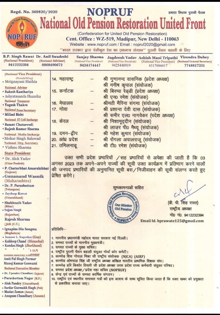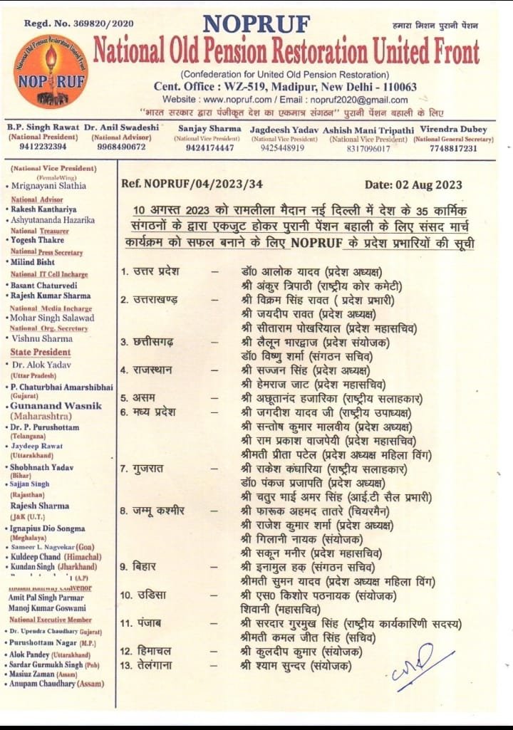 रायपुर 03 अगस्त 2023। राष्ट्रीय अध्यक्ष पीपी सिंह रावत राष्ट्रीय पुरानी पेंशन बहाली संयुक्त मोर्चा द्वारा पुरानी पेंशन बहाली की मांग को लेकर राष्ट्रीय स्तर पर विगत कई सालों से निरंतर एनपीएस कर्मचारियों को विभिन्न राज्यों के समस्त कर्मचारी अधिकारियों को संगठित करके पूरे देश में पुरानी पेंशन बहाली की मांग को लेकर आंदोलन किया जा रहा है जिस कड़ी में छत्तीसगढ़ राज्य के भी विभिन्न विभागों के कर्मचारियों एवं शिक्षकों के विभिन्न संगठन शामिल रहे एवं राष्ट्रीय नेतृत्व बीपी सिंह रावत राष्ट्रीय अध्यक्ष के कुशल नेतृत्व में छत्तीसगढ़ राज्य में पुरानी पेंशन बहाली संभव हुआ किंतु देश के अधिकांश राज्य एवं केंद्र सरकार ने पुरानी पेंशन लागू नहीं किया है जिसे लागू कराने के लिए क्रमश सभी राज्यों में आंदोलन निरंतर किया जा रहा है एवं 1 मई2023 को दिल्ली में संसद मार्च कर एक ऐतिहासिक आंदोलन प्रदर्शन कर पुरानी पेंशन बहाली की आवाज को केंद्र सरकार का ध्यान आकृष्ट कराकर सफल आंदोलन किया गया जिसका सफल नेतृत्व छत्तीसगढ़ की ओर से छत्तीसगढ़ क्रांतिकारी शिक्षक संघ के प्रदेश अध्यक्ष लैलून कुमार भारद्वाज ने किया समूचे देश में पुरानी पेंशन बहाली के साथ 20 साल की सेवा के बाद पूर्ण पेंशन लागू करने की मांग को लेकर 10 अगस्त 2023 को दिल्ली स्थित रामलीला मैदान में विशाल धरना प्रदर्शन के साथ संसद मार्ग किया जाएगा जिसमें देश के विभिन्न रेलवे शिक्षा उच्च शिक्षा स्वस्थ एवम अन्य बहुत कर्मचारियों अधिकारियों के अन्य संगठन को बड़े पैमाने पर शामिल कर प्रदर्शन किया जाएगा जिसे सफल बनाने छत्तीसगढ़ राज्य की कमान राष्ट्रीय अध्यक्ष बी पी सिंह रावत ने इकलौते युवा संघर्षशील कर्मचारी नेता प्रदेश अध्यक्ष क्रांतिकारी शिक्षक संघ लैलून कुमार भारद्वाज को राष्ट्रीय पुरानी पेंशन बहाली संयुक्त मोर्चा छत्तीसगढ राज्य का प्रदेश संयोजक नियुक्त किया गया छत्तीसगढ़ के कर्मचारियों अधिकारियों और शिक्षकों ने हर्ष व्यक्त करते हुए नवनियुक्तछग प्रदेश संयोजक लैलून कुमार भारद्वाज को बधाई एवं शुभकामनाएं दी है शांति थवाईत सुभाष पटेल नरसिंह श्रीवास पुनि अनंत जगजीवन जांगड़े फकीरा यादव अशोक साहू प्रमोद महेश बलधीर टोप्पो संदीप कुमार राकेश कुमार राजगीर विजय भास्कर सतीश भारद्वाज कामता जांगड़े राजकुमार नारग लक्मेदर बौद्ध अभिनय नारंग एवं समस्त कर्मचारियों शिक्षको ने बधाई दिए।