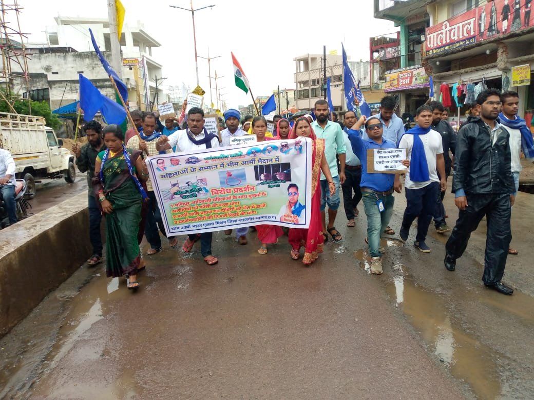 जांजगीर|| भीम आर्मी भारत एकता मिशन छत्तीसगढ़ जिला जांजगीर चाम्पा जिलाध्यक्ष कलेशवर खुंटे के नेतृत्व में दिनाँक 02/08/23 को जांजगीर कचहरी चौक से नेता जी चौक तक भीम आर्मी कार्यकर्ताओं एवम माता बहनों के साथ बारिश में भीगते हुए राज्य सरकार कांग्रेस व केंद्र सरकार भाजपा के खिलाफ जमकर नारे बाजी के साथ पैदल मार्च निकाला। वर्तमान में अनुसूचित जाति,अनुसूचित जनजाति के लोगो पर अन्यान्य अत्याचार शोषण असहनीय है।छत्तीसगढ़ शासन सामान्य प्रशासन विभाग, मंत्रालय द्वारा फर्जी प्रमाणपत्र धारकों के विरुद्ध कार्रवाई किए जाने के संबंध में समस्त मुख्य सचिव/ प्रमुख सचिव के नाम से आदेश जारी हुआ था,परंतु कांग्रेस की सरकार व प्रशासन ने आदेश का आज पर्यंत पालन नहीं किया है। जिसकी मांग कुछ SC/ST युवाओं के द्वारा बहुत पहले से किया जा रहा था। युवाओं द्वारा इस विषय को लेकर आमरण अनशन भी किया गया था जिसको सरकार ने किसी भी प्रकार से गंभीरता से लेने का काम नहीं किया इसलिए इन युवाओं को अंत में मजबूर होकर निर्वस्त्र होकर विधानसभा के सामने प्रदर्शन करना पड़ा जो कि किसी भी सरकार के लिए बहुत ही शर्म की बात है। 2000 से 2020 तक फर्जी प्रमाण पत्र के कुल 758 पदों की शिकायतें मिली थी 659 प्रकरणों की जांच हुई जिसमें 267 प्रकरणों में जाति प्रमाण पत्र पर फर्जी पाए गए ,जिनके के ऊपर कार्रवाई की मांग को लेकर निर्वस्त्र प्रदर्शन करने वाले युवाओं को विभिन्न धाराएं लगाकर गिरफ्तार करके केंद्रीय रायपुर जेल भेज दिया गया है जो कि पूर्णतः अनुचित है, उनके ऊपर लगे समस्त धाराओं को निरस्त कर तत्काल निःशर्त रिहा किया जाए व फर्जी प्रमाणपत्र धारी कर्मचारियों को तत्काल बर्खास्त कर जेल में डाला जाए।