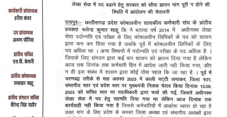 रायपुर: छत्तीसगढ़ प्रदेश कोषालय शासकीय कर्मचारी संघ के प्रांतीय प्रवक्ता रूपेंद्र साहू ने बताया कि वर्ष 2014 से अधीनस्थ लेखा सेवा पदोन्नति एवं परीक्षा के लिए कोषालय लिपिक के पद को शासन द्वारा कम कर दिया गया है जबकि पूर्व में कोषालय लिपिक के लिए पद अधिक था अन्य विभागों में पदोन्नति एवं परीक्षा के पद अधिक है जिसके लिए संगठन द्वारा कई बार शासन को ज्ञापन दिया गया लेकिन आज तक कर्मचारी हित में आदेश जारी नहीं किया गया, और ना ही इस संबंध में शासन द्वारा कोई ठोस पहल की जा रही है पूर्व में चरणबद्ध तरीके से माह अगस्त 2023 से काली पट्टी लगाकर जिला स्तर संभाग स्तर एवं प्रदेश स्तर पर मुख्यमंत्री निवास घेराव किया दिनांक 13 सितंबर 2023 को सचिव स्तर पर पदाधिकारी द्वारा चर्चा की गई जिसमें अधीनस्थ लेखा सेवा में पद बढ़ाने हेतु सहमति दिया गया था लेकिन आज दिनांक तक कार्यवाही नहीं किया गया है जिससे कर्मचारियों में आक्रोश प्राप्त हो रहा है उक्त मांग के लिए प्रदेश के समस्त जिला अध्यक्ष एवं संभागीय अध्यक्ष द्वारा कई बार पत्राचार किया गया लेकिन आज दिनांक तक कार्यवाही अपेक्षित है।