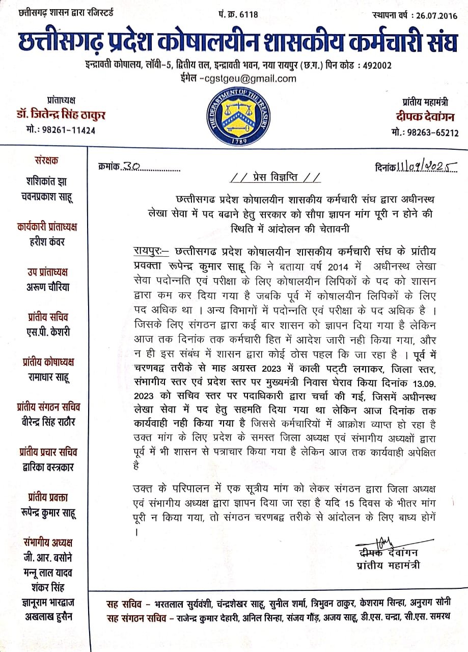 सूचनाकर्ता दीपक देवांगन प्रांतीय महामंत्री छत्तीसगढ़ प्रदेश कोषालय शासकीय कर्मचारी संघ