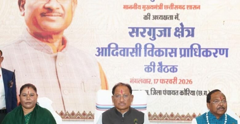 रायपुर 17 फरवरी 2026/ मुख्यमंत्री विष्णु देव साय की अध्यक्षता में आज कोरिया जिले के बैकुंठपुर में आयोजित सरगुजा क्षेत्र आदिवासी विकास प्राधिकरण की बैठक में सरगुजा संभाग के जिलों में संचालित विकास कार्यों की प्रगति की विस्तृत समीक्षा की गई तथा जनप्रतिनिधियों के सुझावों के आधार पर नई योजनाओं को स्वीकृति प्रदान की गई।