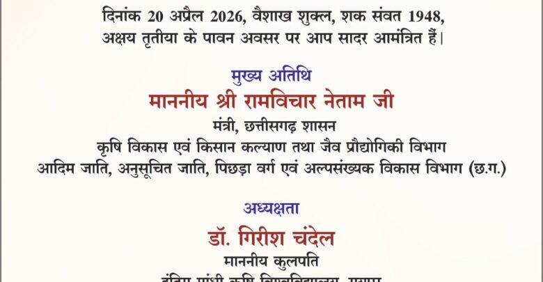 रायपुर, 19 अप्रैल 2026। अक्षय तृतीया के अवसर पर इंदिरा गांधी कृषि विश्वविद्यालय में 20 अप्रैल को “अक्ती तिहार” का राज्य स्तरीय आयोजन किया जाएगा। यह कार्यक्रम स्वामी विवेकानंद कृषि अभियांत्रिकी महाविद्यालय एवं अनुसंधान केंद्र के पास स्थित प्रक्षेत्र में प्रातः 10:30 बजे से आयोजित होगा।
